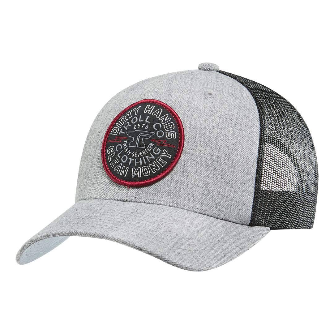 The DHCM Shocker Curved Brim Trucker features bold lightning bolts, jagged script, the Dirty Hands Clean Money motto.